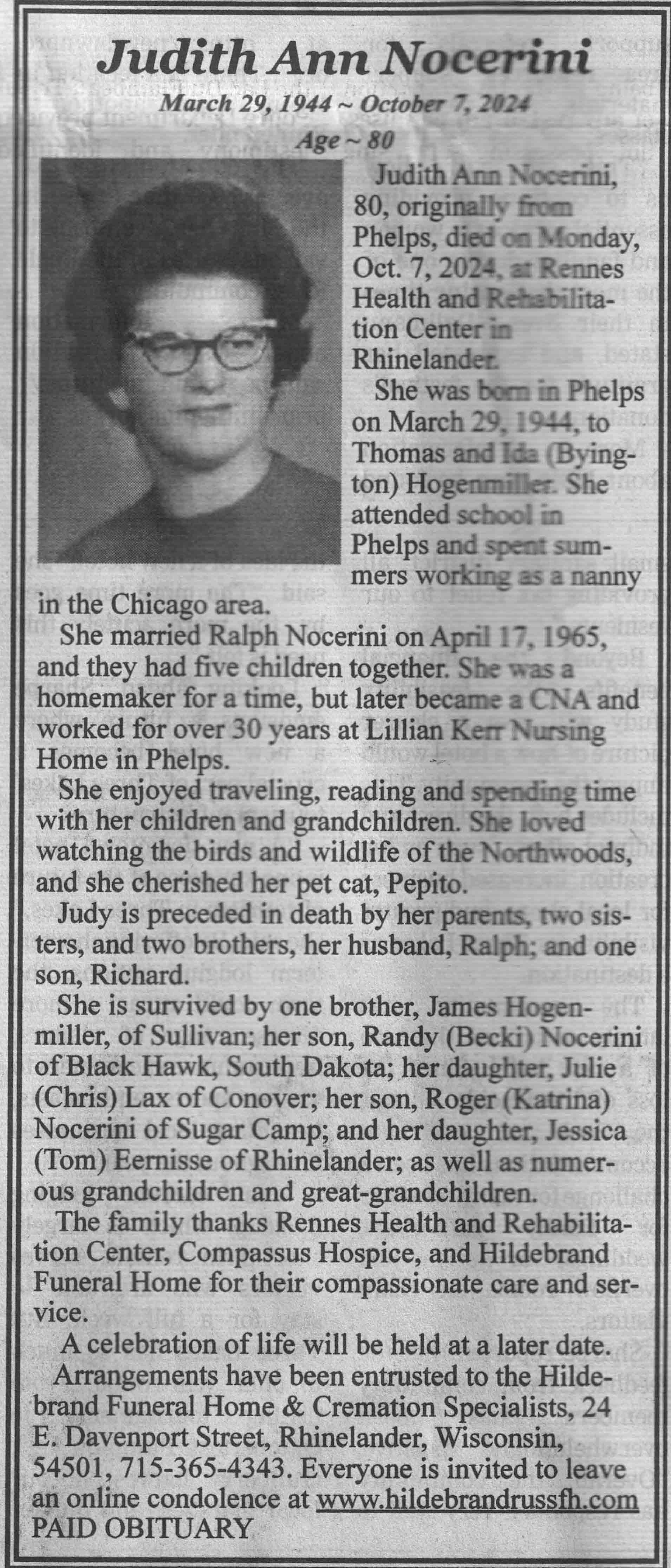 | Nocerini | Judith Ann (Hogenmiller) | 29 Mar 1944 | 07 Oct 2024 | VCNR | 23 Oct 2024 | 4A |
