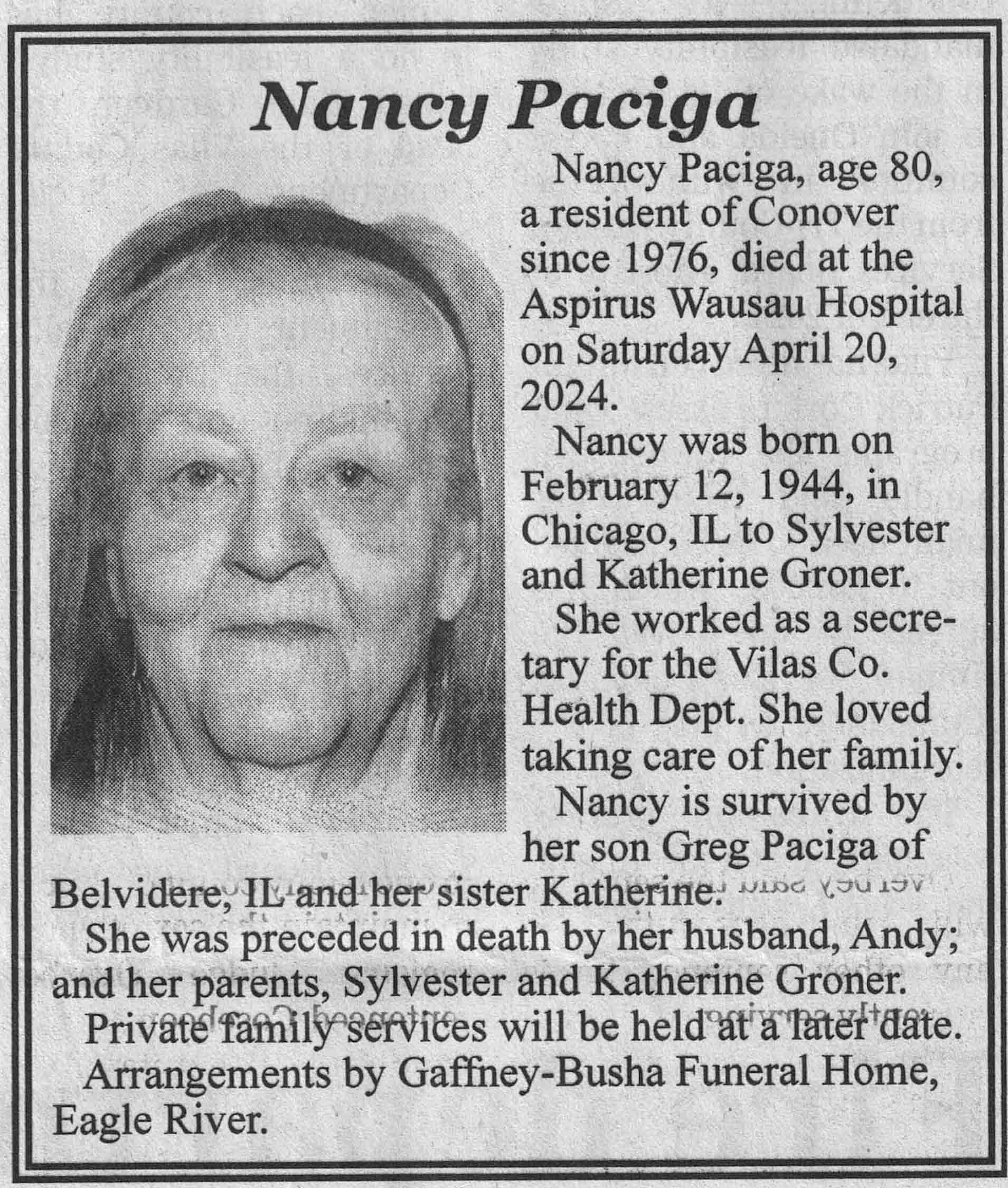 | Paciga | Nancy (Groner) | 12 Feb 1944 | 20 Apr 2024 | VCNR | 24 Apr 2024 | 4A |