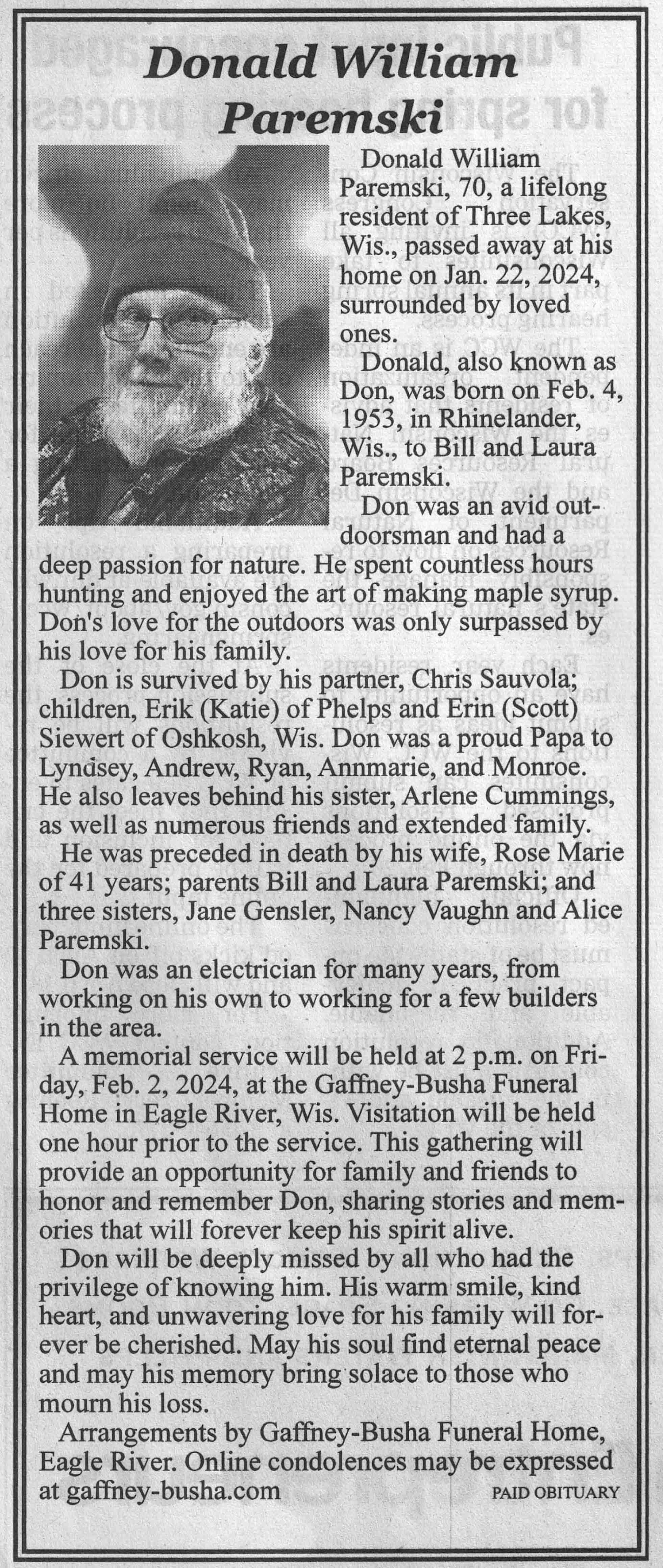 | Paremski | Donald William | 04 Feb 1953 | 22 Jan 2024 | VCNR | 31 Jan 2024 | 4A |