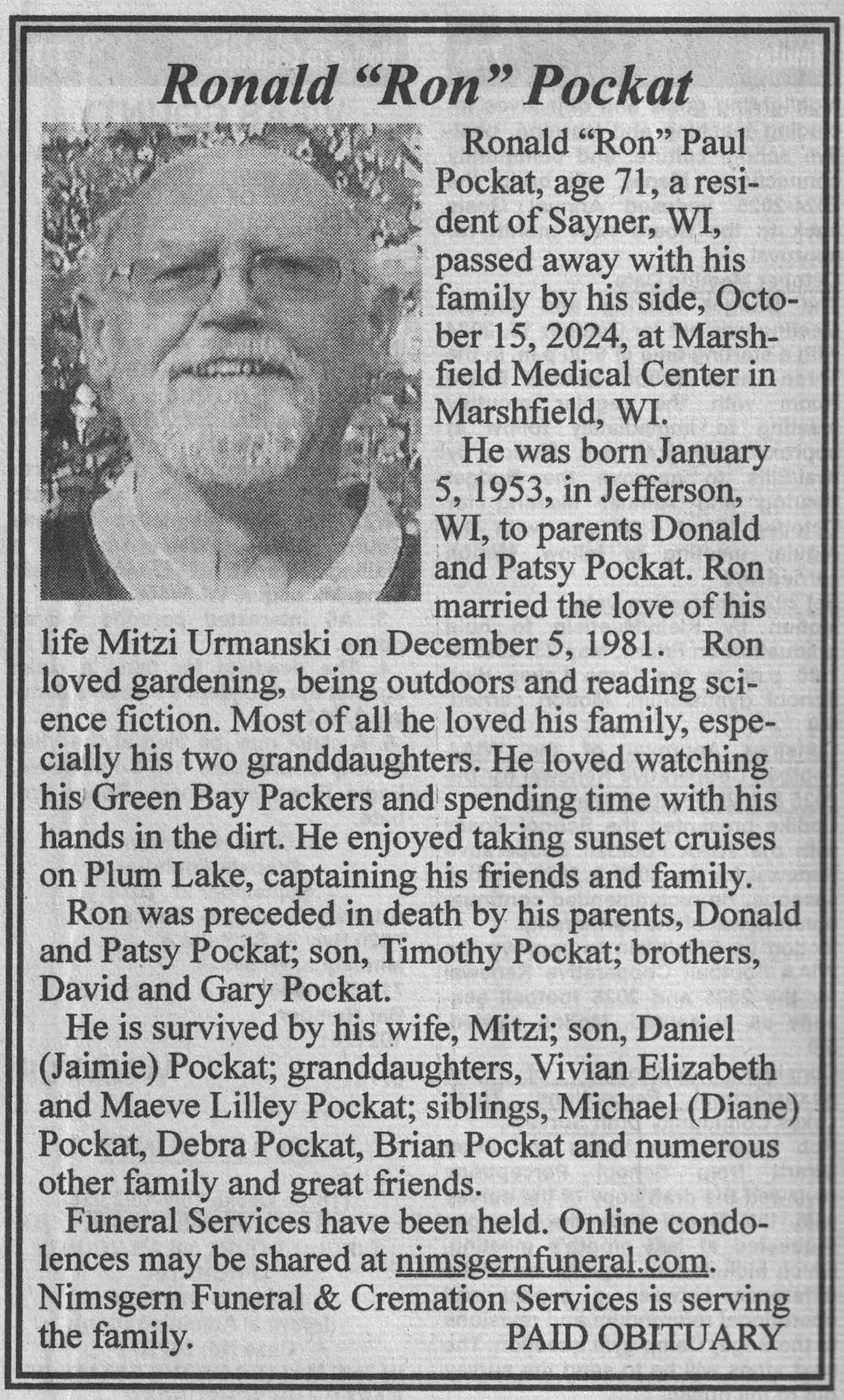| Pockat | Ronald Paul 'Ron' | 05 Jan 1953 | 15 Oct 2024 | VCNR | 23 Oct 2024 | 5A |