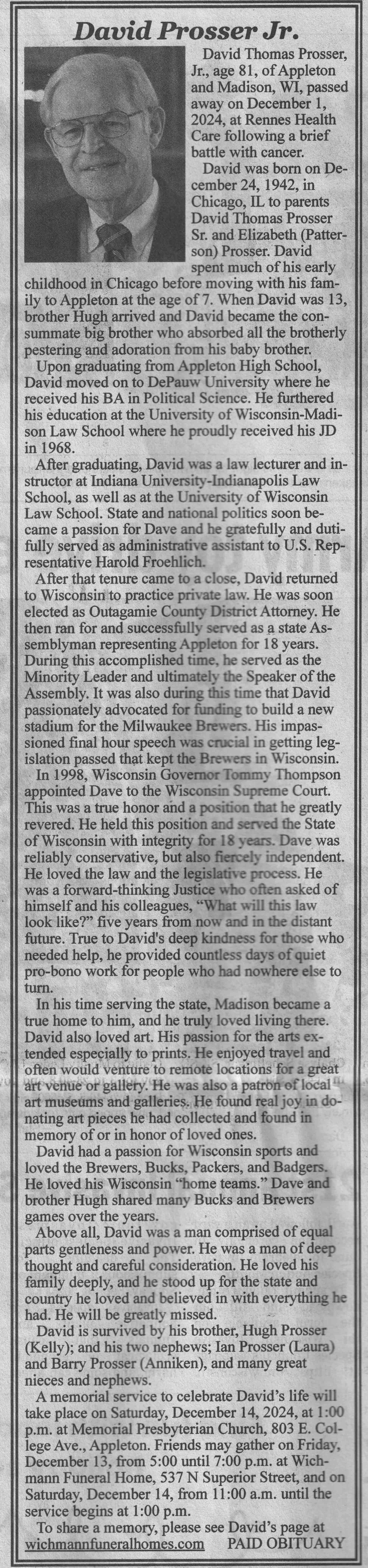 | Prosser | David Thomas, Jr | 24 Dec 1942 | 01 Dec 2024 | VCNR | 11 Dec 2024 | 4A |