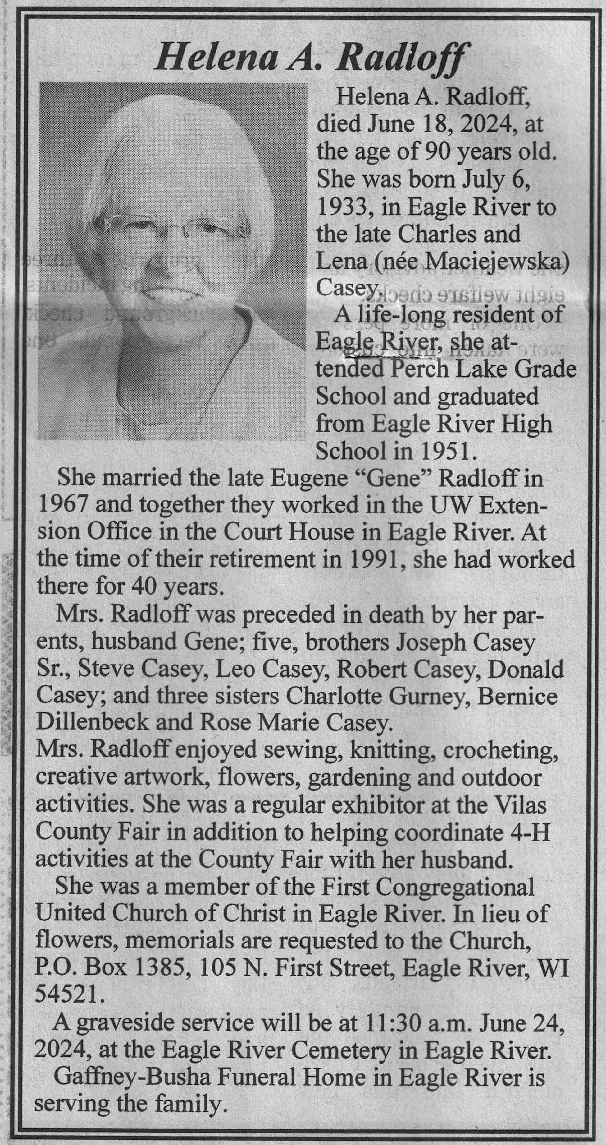 | Radloff | Helena A (Casey) | 06 Jul 1933 | 18 Jun 2024 | VCNR | 26 Jun 2024 | 4A |