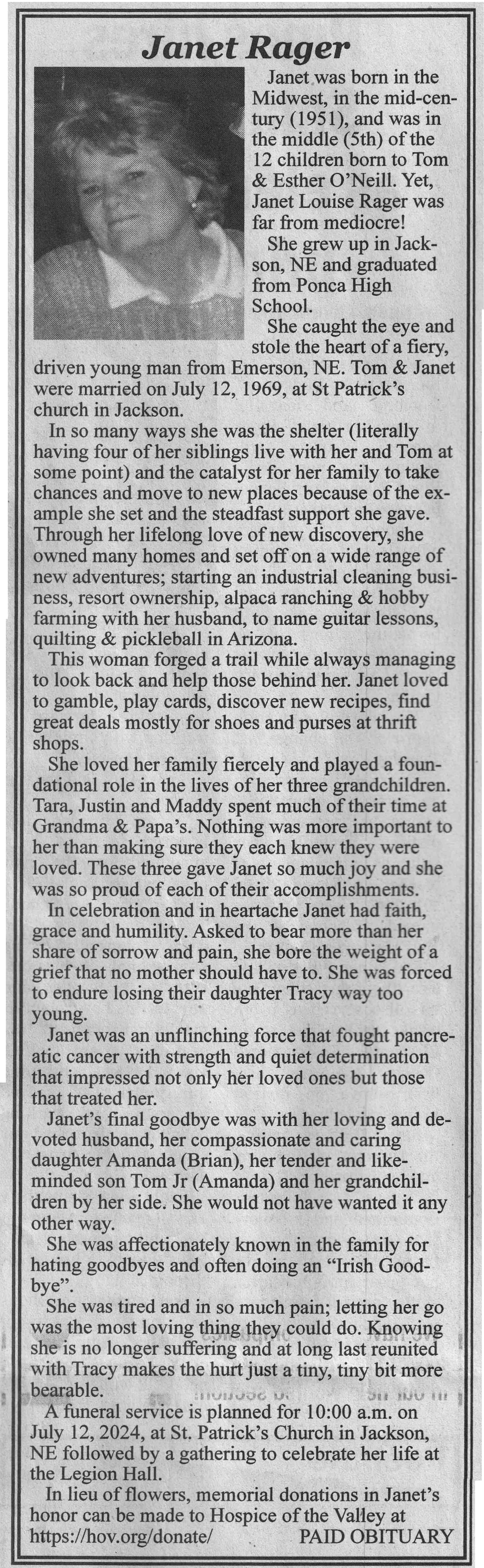 | Rager | Janet (O'Neill) | 1951 | c Apr 2024 | VCNR | 01 May 2024 | 4A |