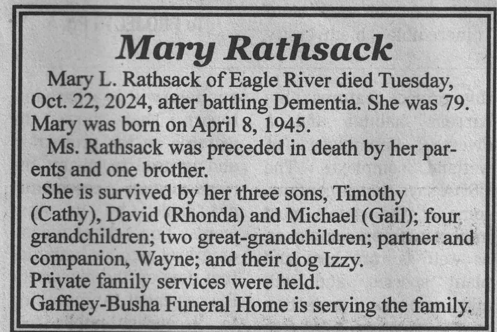 | Rathsack | Mary | 08 Apr 1945 | 22 Oct 2024 | VCNR | 06 Nov 2024 | 4A |