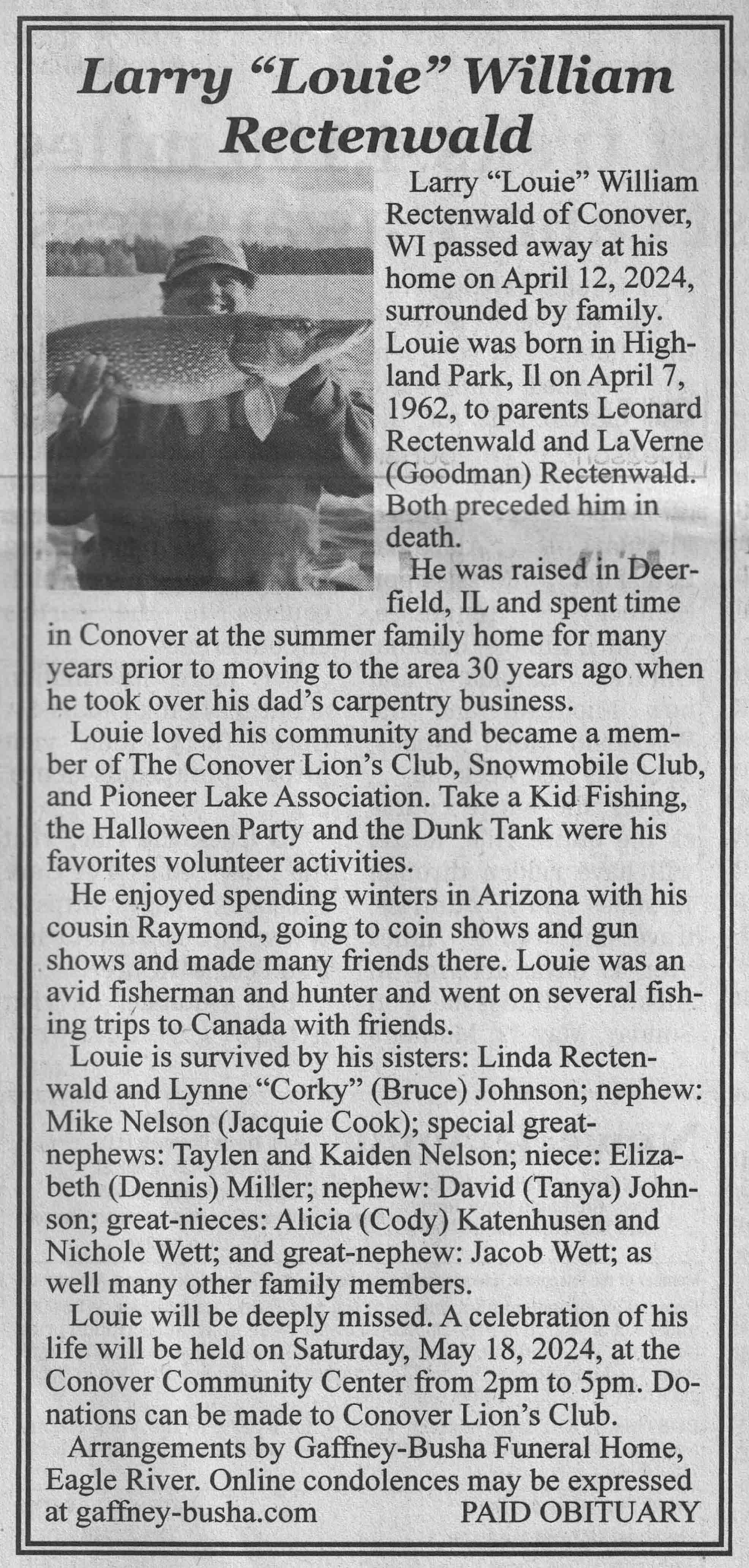 | Rectenwald | Larry William 'Louie' | 07 Apr 1962 | 12 Apr 2024 | VCNR | 08 May 2024 | 4A |