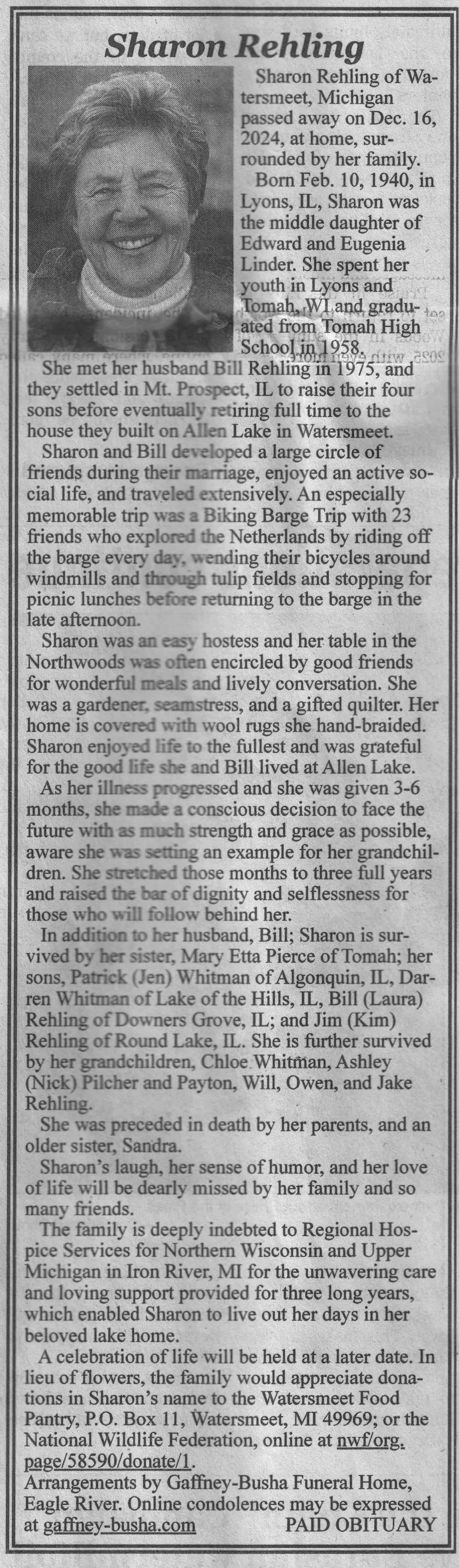 | Rehling | Sharon (Linder) | 10 Feb 1940 | 16 Dec 2024 | VCNR | 25 Dec 2024 | 4A |