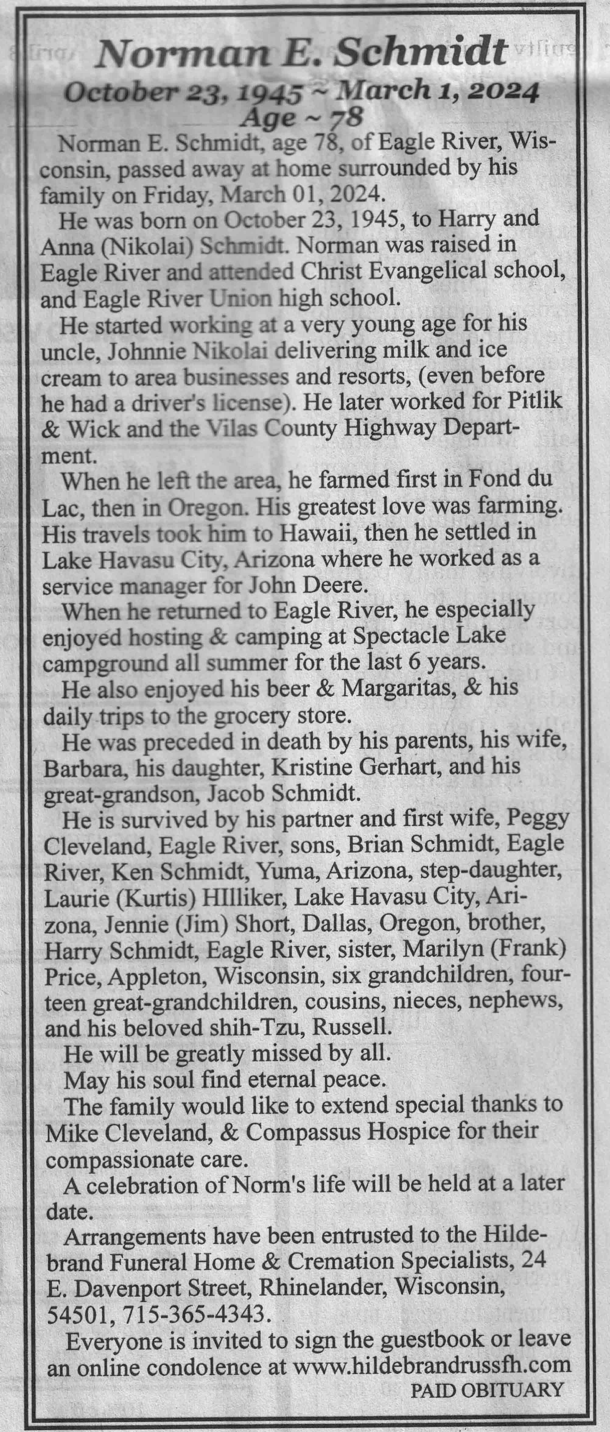 | Schmidt | Bobbie (Conklin) | 09 Jul 1946 | 18 Dec 2024 | VCNR | 15 Jan 2025 | 4A |