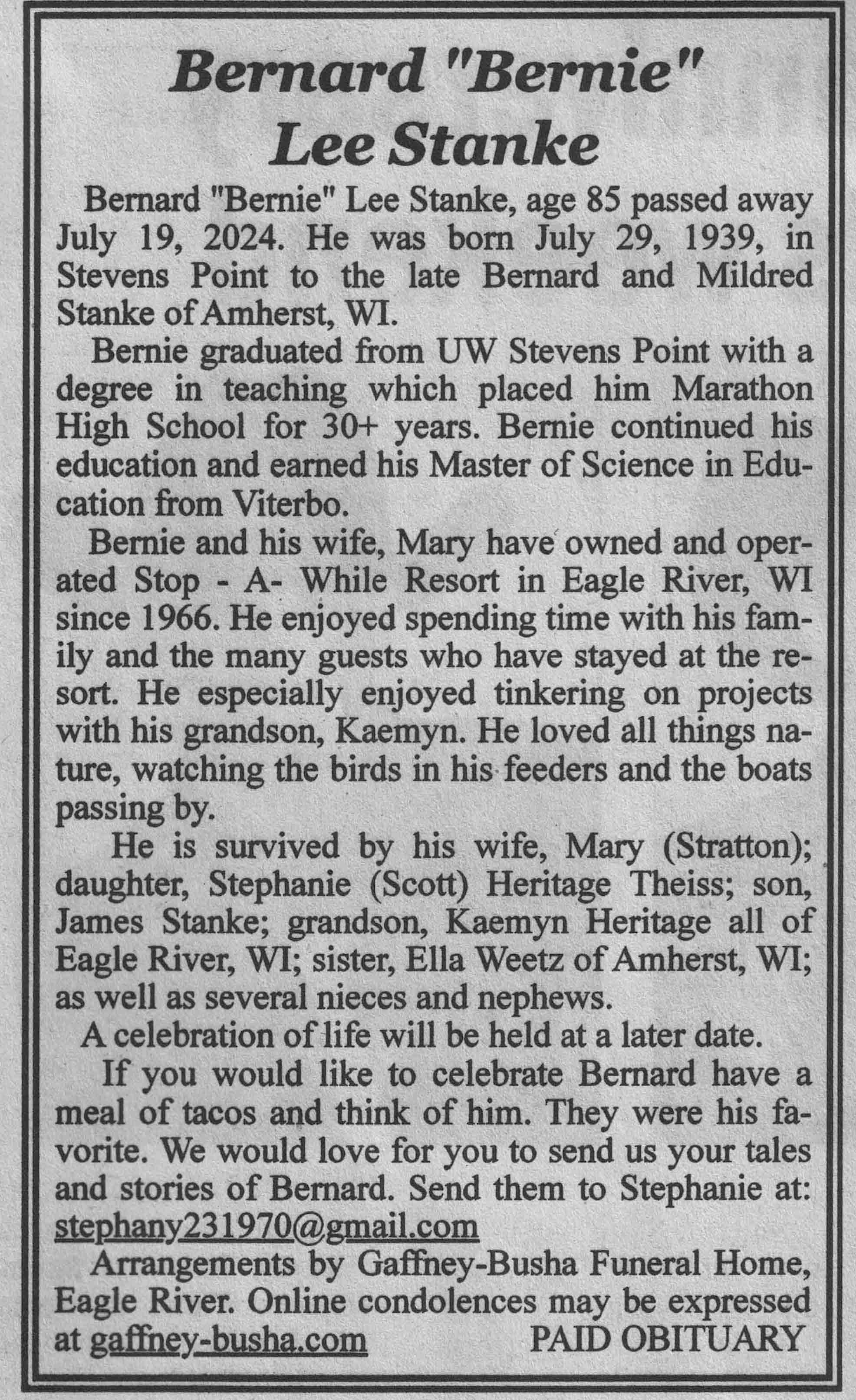 | Stanke | Bernard Lee 'Bernie' | 29 Jul 1939 | 19 Jul 2024 | VCNR | 31 Jul 2024 | 4A |