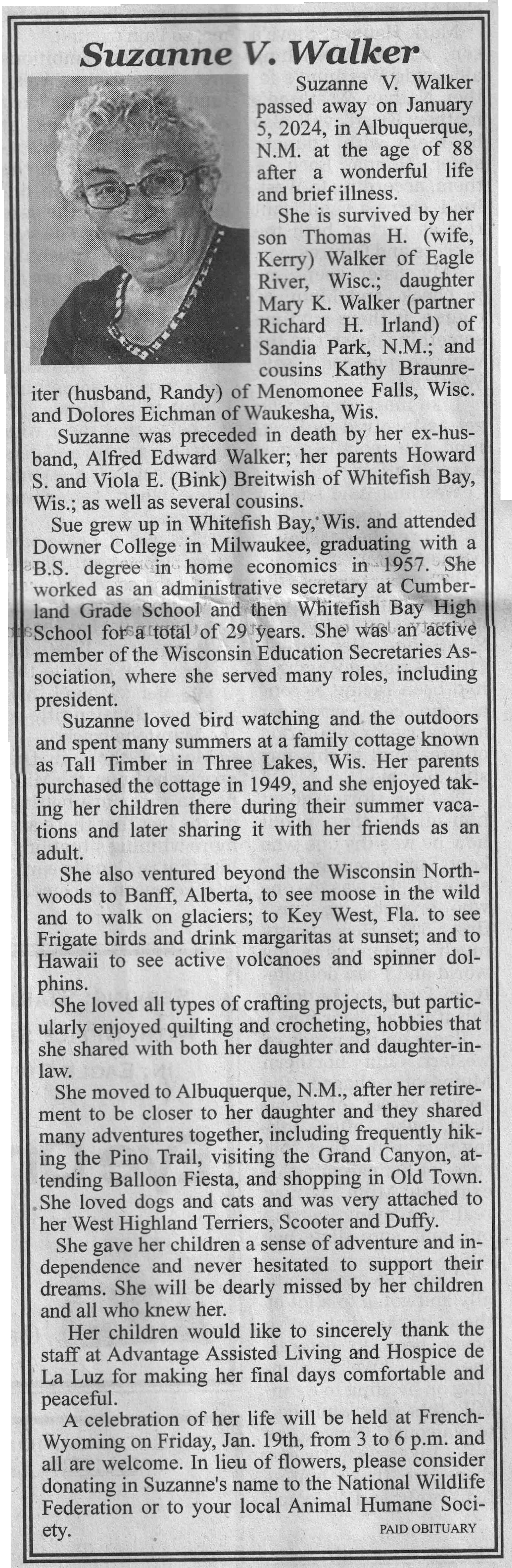 | Walker | Suzanne V (Breitwish) | c 1936 | 05 Jan 2024 | VCNR | 17 Jan 2024 | 4A |