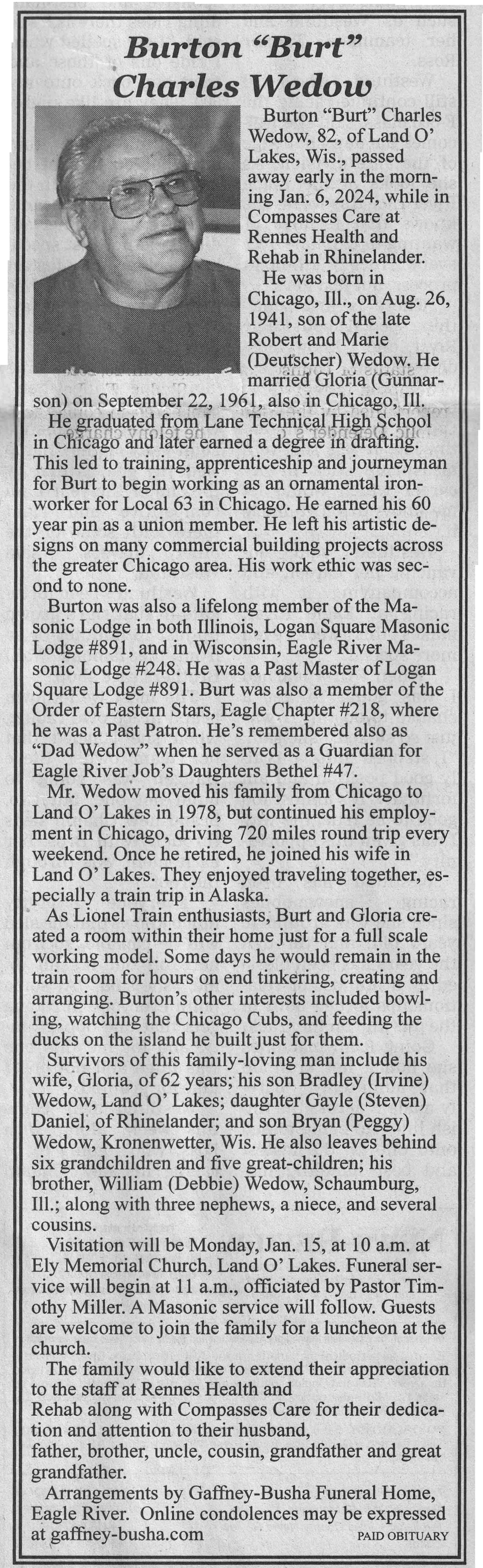 | Wedow | Burton Charles 'Burt' | 26 Aug 1941 | 06 Jan 2024 | VCNR | 17 Jan 2024 | 4A |