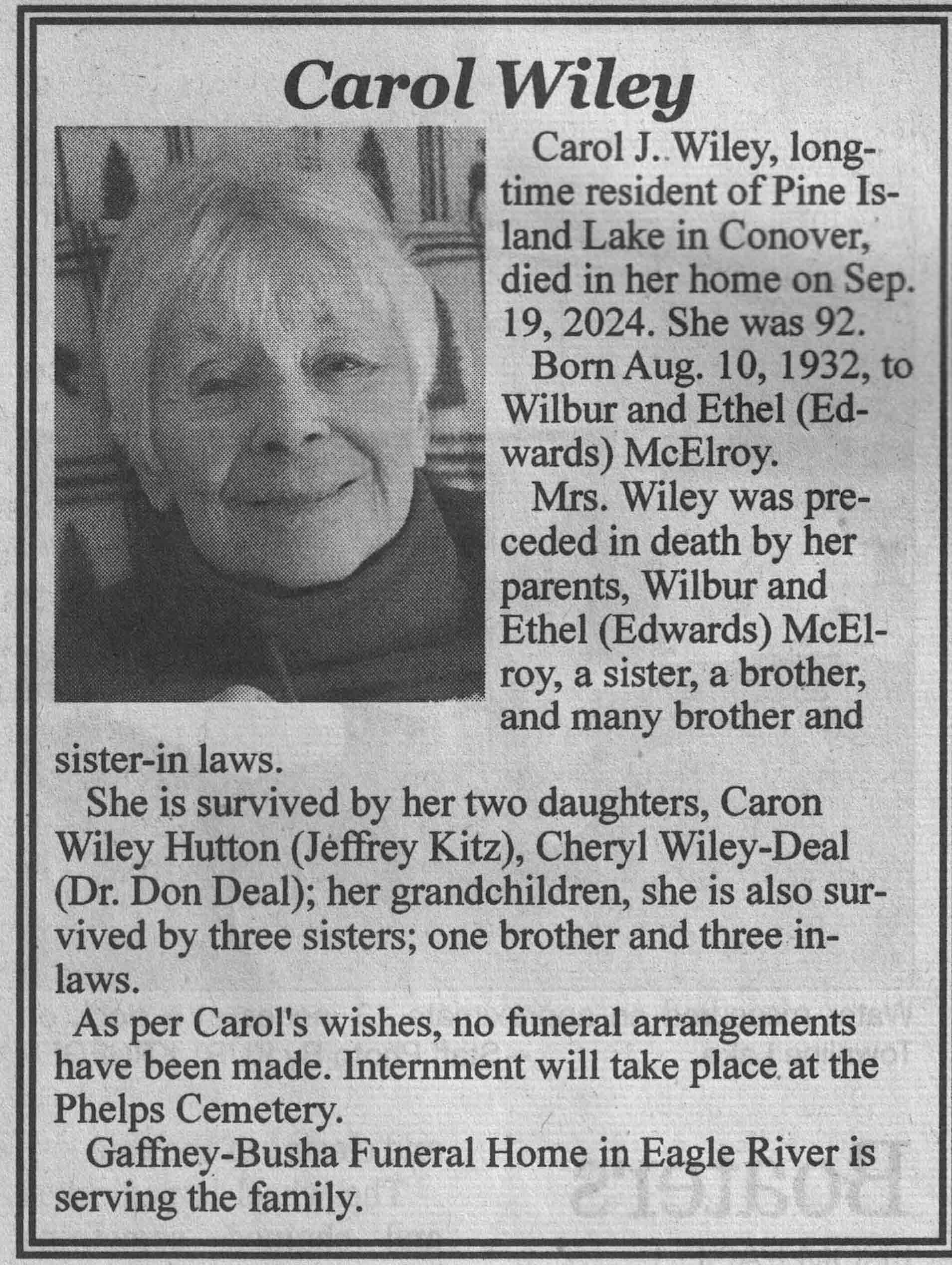 | Wiley | Carol J (McElroy) | 10 Aug 1932 | 19 Sep 2024 | VCNR | 23 Oct 2024 | 4A |