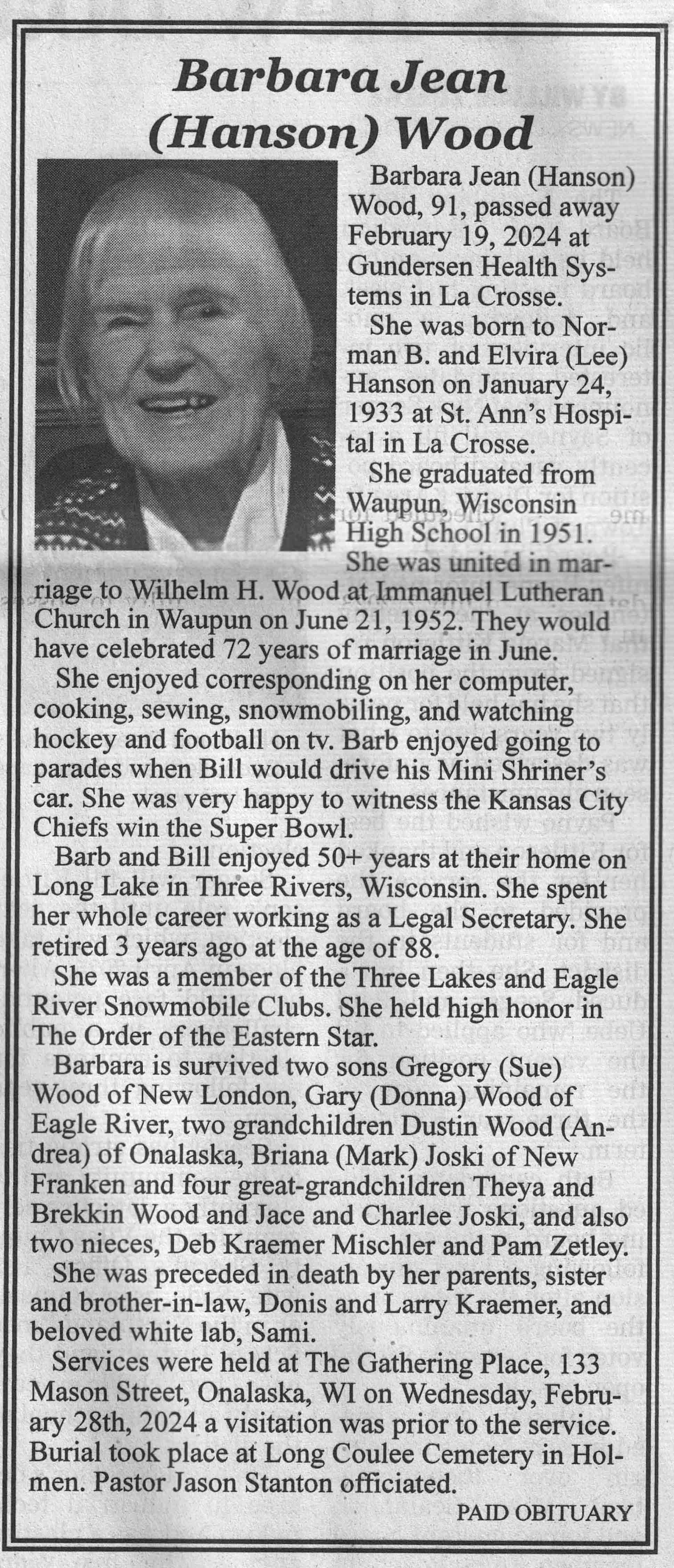 | Wood | Barbara Jean (Hanson) | 24 Jan 1933 | 19 Feb 2024 | VCNR | 06 Mar 2024 | 4A |